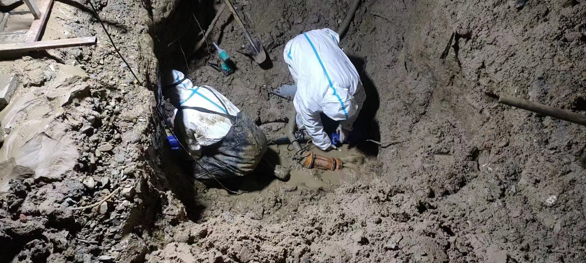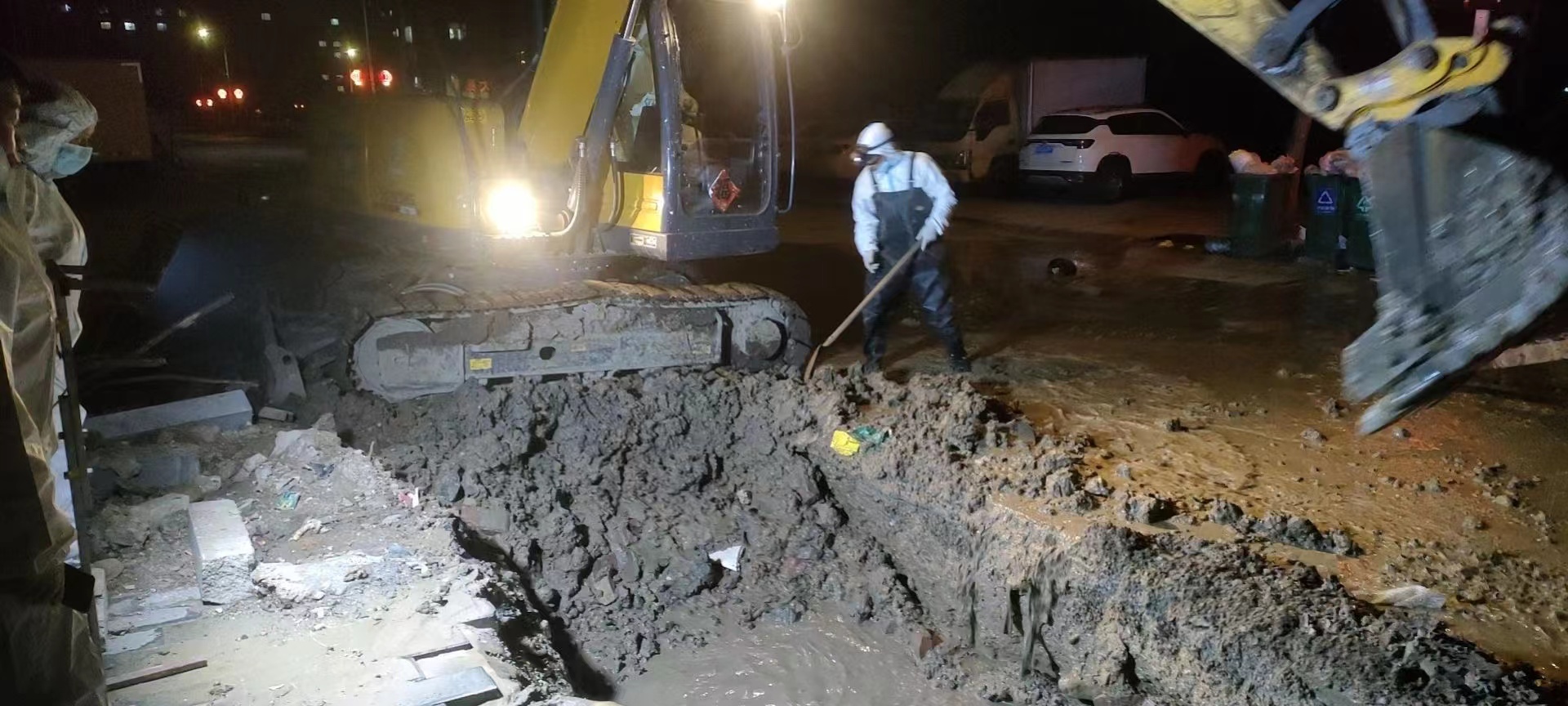 3月15日晚9點多,鲅魚圈分公司接到宋屯小區(qū)物業(yè)的求助電話,小區(qū)內(nèi)主路有大量積水,疑是自來水管道漏水,宋屯小區(qū)全部停水,分公司維修隊全體成員在隊長唐有的帶領(lǐng)下,迅速做好個人防護(hù),對人員和設(shè)備及材料進(jìn)行消殺后,第一時間奔赴漏水現(xiàn)場。經(jīng)詳實探查發(fā)現(xiàn)是通往宋屯小區(qū)的供水DN900mm主管道管網(wǎng)漏水,現(xiàn)場電、氣、通訊等各條線路縱橫交錯,給搶修工作帶來巨大不便,唐有和隊員們迎難而上,在零下10多度的低溫下輪流上陣,用鐵鍬一點一點掏挖出操作空間。厚重的防護(hù)服、護(hù)目鏡等防護(hù)用具使搶修人員們的動作顯得有些笨拙,憑借著豐富的搶修經(jīng)驗,夜里12時許將漏點挖出,直至凌晨1點半,恢復(fù)了宋屯小區(qū)的正常供水。