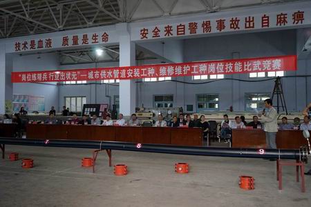 為深入推進(jìn)學(xué)習(xí)型企業(yè)和員工隊伍建設(shè),不斷激發(fā)促進(jìn)職工學(xué)習(xí)專業(yè)技術(shù)、熟練崗位業(yè)務(wù)的積極性,努力提升自身技能素質(zhì)和企業(yè)服務(wù)社會、服務(wù)民生的質(zhì)量水平,8月31日,水務(wù)集團(tuán)與市總工會聯(lián)合舉辦了“城市供水管道安裝工種、維修維護(hù)工種崗位技能比武競賽”。市總工會常務(wù)副主席相燾同志,以及市總工會其他相關(guān)部門的負(fù)責(zé)同志出席競賽。集團(tuán)公司董事長、總經(jīng)理、黨委副書記王霄同志、黨委書記戴宏偉同志及集團(tuán)公司全體領(lǐng)導(dǎo)班子和本次競賽領(lǐng)導(dǎo)小組的其他同志,以及新聞媒體朋友受邀觀摩了此次競賽。